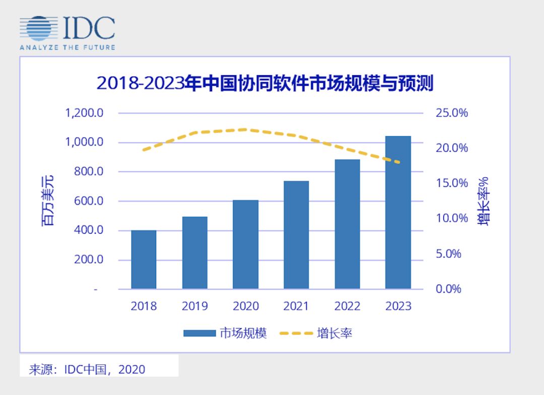 IDC 数据显示,2019 年中国协同软件市场大约为 4.9 亿美元,其中基于公有云的在线协同软件市场达到 2.7 亿美元,第一次超过本地部署的协同办公软件。预计到 2023 年,中国协同软件市场将超过 10 亿美元,绝大部分的贡献将来自公有云的在线协同软件,届时其市场占比将超过 70%。