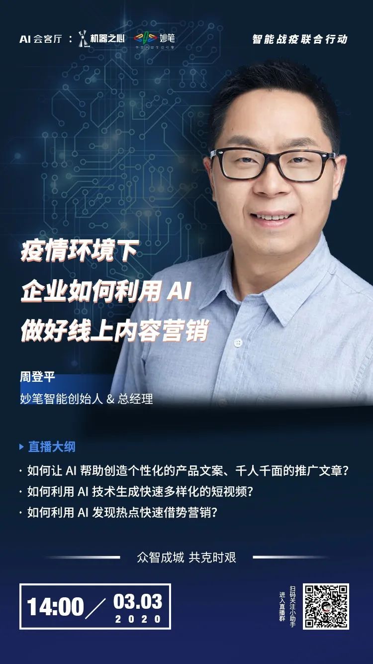 如何用 AI 写出千人千面的品牌推广文章?如何用 AI 分析可借力的热点?智能战疫「AI+营销自动化」在线分享第三期,机器之心邀请到了妙笔智能创始人周登平,带来「疫情环境下,企业如何利用 AI 做好线上内容营销」主题分享。3月3日(周二)14:00,识别二维码添加机器之心小助手,立即加入直播群。