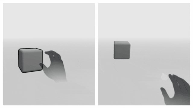 与手柄不同的是,手势操作不涉及物理按键,在与虚拟物体交互时难以获得反馈,可能会让用户无法确定手势可以触发哪些功能。因此,Oculus建议开发者通过一些持续或明显的视觉反馈或标记来提示用户不同手势的效果。