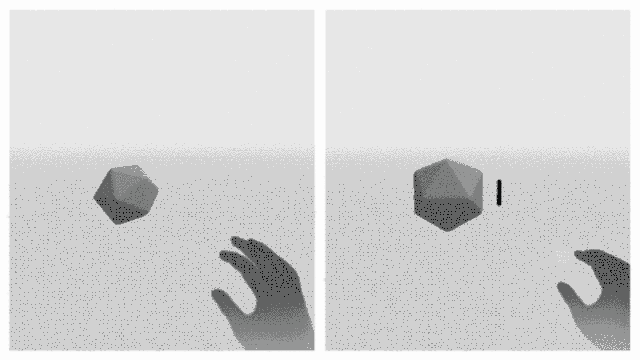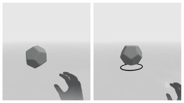 对于近处的交互,可选用短小的定向指针来进行瞄准,指针的形状、色彩和透明度会根据用户食指和拇指之间的距离来变化,提示用户交互的状态。光标则可以提示手势目前瞄准的目标,当做出捏的动作时,光标会跳动,提示输入成功,当两个手指松开时则恢复原样。为了避免光标遮挡视线,Oculus将它设为半透明式,并使用较深的轮廓来加深它的存在感,同时光标的角直径是恒定的,与距离成反比。