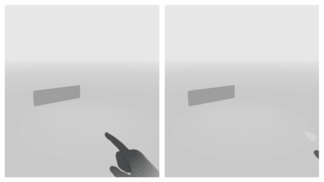 此外,Oculus认为手势识别的光标或射线并不需要一直出现,只有当食指和拇指靠近并远离躯干,与屏幕呈现特定角度时(体现用户希望与菜单交互的意图)才出现,好处是避免遮挡视线,打破沉浸感。