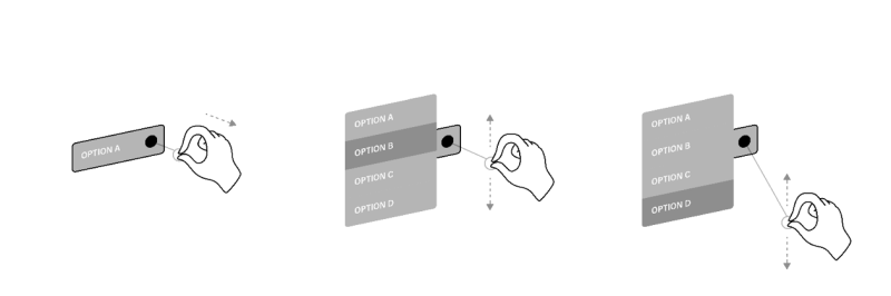 对于捏+拉这个手势,开发者可加入虚拟操纵杆来提高精准性,同时它对于1D、2D和3D界面也可以有不同功能。1D界面中,操纵杆以一个轴移动,可用于翻页、快进功能。2D界面中,用户可通过两个轴的方向来进行操作,适用于颜色选取或辐射状选择器,用户可以先将调色盘拉出,然后控制操纵杆来选取不同的颜色。而在3D界面中,用户可从三个轴方向进行操作,可用于立体的调色盘等场景。