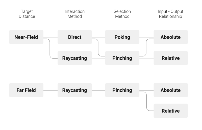 与交互方式相同,用手势进行选择也分为两大类,一是直接与近处的目标触碰,而是通过捏的动作来确认选项。考虑到手势操作不具备手柄能提供的体感反馈,开发者需要用视觉提示和反馈来弥补。而捏这个动作本身会带来触觉反馈,刚好为手势识别带来体感反馈功能。