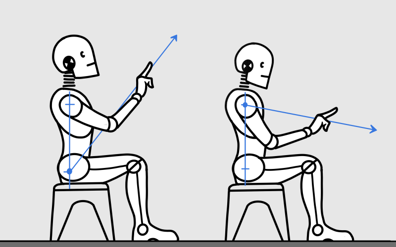 此外,考虑到手在移动时也会带动身体颤动,可能会让raycasting的光标产生漂移,因此Oculus将raycasting的起始点固定在身体的特定位置来提高稳定性。当你在站着的时候,起始点设定在肩膀位置,你所选择的目标通常在肩膀一下。而坐着的时候,目标通常在肩膀以上,所以起始点设定在臀部,体验感比较舒适。