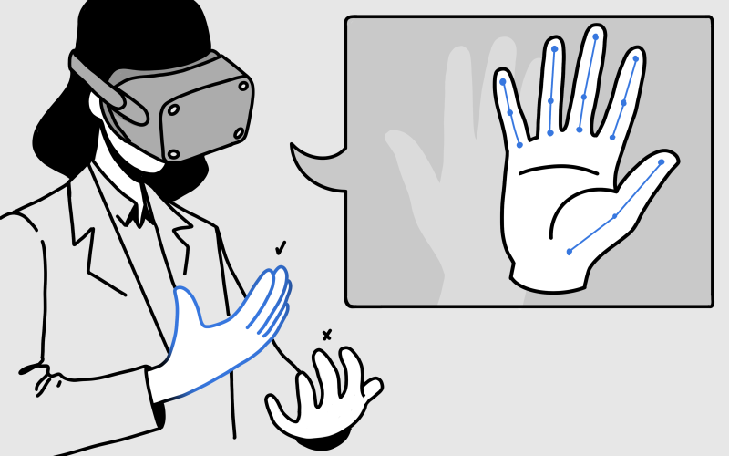 控制手势逻辑的重要性在于,可降低误触的可能,Oculus为不同状态的手势提供了一些范例。当用户的手在追踪区域内静止时,为避免手指卷曲的动作产生误触,开发者可做出以下设定:当手部在与头显达到特定距离,并且在一定时间内没有移动时,将不再进行追踪,当手部再次进入追踪区域内时才会开始识别。
