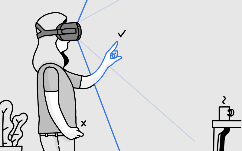 当与远处的虚拟物体交互时,可使用类似于手柄点选功能的raycasting方式,可更精确定位远处的物体,从人体工学角度来讲也更舒适。