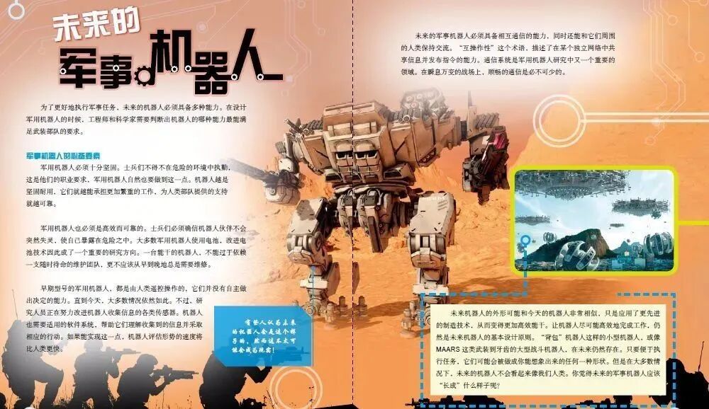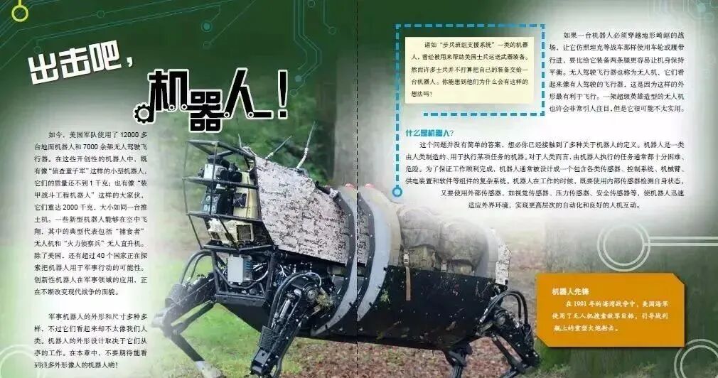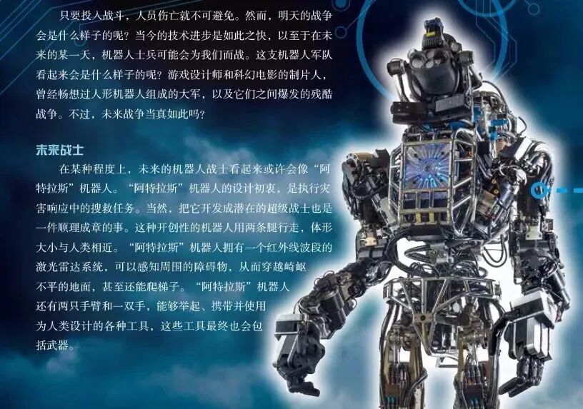 如书中回顾了机器人的发展史,讲到了现在各种机器人的“前生”是怎么样的。比如军事机器人,早期的不仅需要人类操作,还需要专门维护的团队。