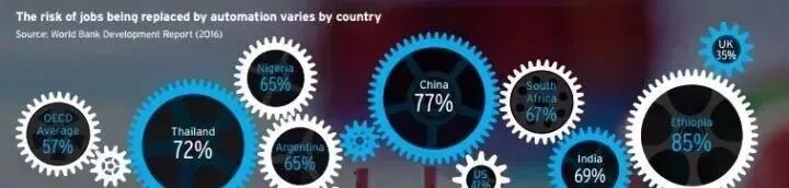 花旗银行联合牛津大学发布了一份名为《TECHNOLOGY AT WORK v2.0》的报告,数据表明,不久的将来,美国47%的工作会被替代,被业界看好的“未来制造中心”印度达到69%,而中国则有77%的工作将会被机器人代替!