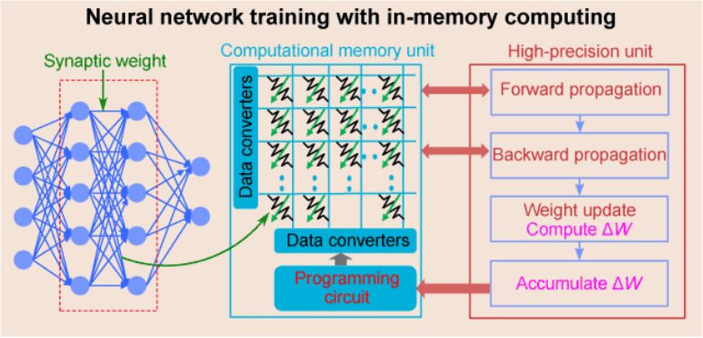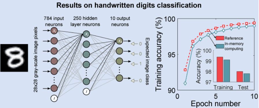 结果(下)。由于存内计算可以通过消除在内存和处理器之间来回移动权重数据的需要,大大加速了训练速度,而且得到的精度比用传统计算机得到的精度只低了不到百分之一。最重要的是,由于相变