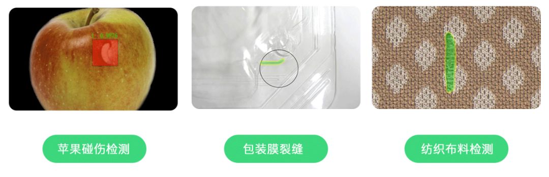 矩视智能工业AI视觉云平台(www.nb-ai.com)还可以应用于其他领域。如果蔬行业的苹果表面缺陷(如擦伤、碰伤、腐烂、龟裂、锈斑、病斑等)检测、包装行业的薄膜表面缺陷(如脏污点、条纹、破损、黑点疵点、毛发、蚊虫等)检测、纺织行业的布匹缺陷(如污点、孔洞、熔点、亮点、昆虫和毛发等)检测等。充分满足越来越多的细分行业的缺陷检测需求,解决了一些因外界因素造成产能无法提升的问题。