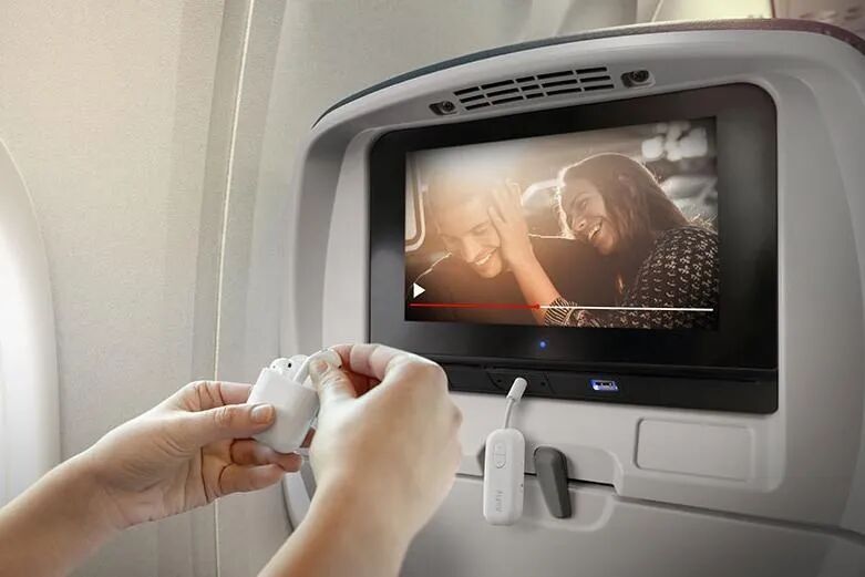 在健身房,AirFly Pro连接到跑步机的耳机孔,可以将Powerbeats Pro与健身房的电视配合使用。在飞机上,只需将AirFly Pro插入飞机上的耳机插孔即可使用你的AirPods。