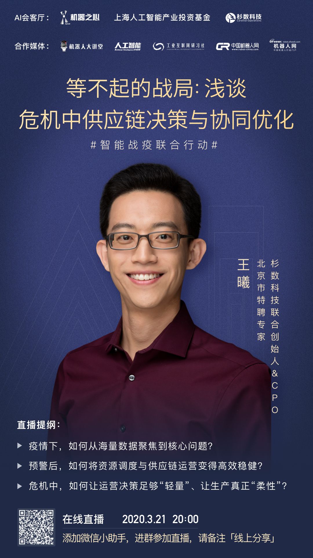 智能战疫「AI+工业自动化化」在线分享第四期,机器之心邀请到了杉数科技联合创始人&CPO 王曦,带来「等不起的战局:危机中供应链决策与协同优化」主题分享。3月21日(周六)20:00,识别二维码添加机器之心小助手,立即加入直播群。