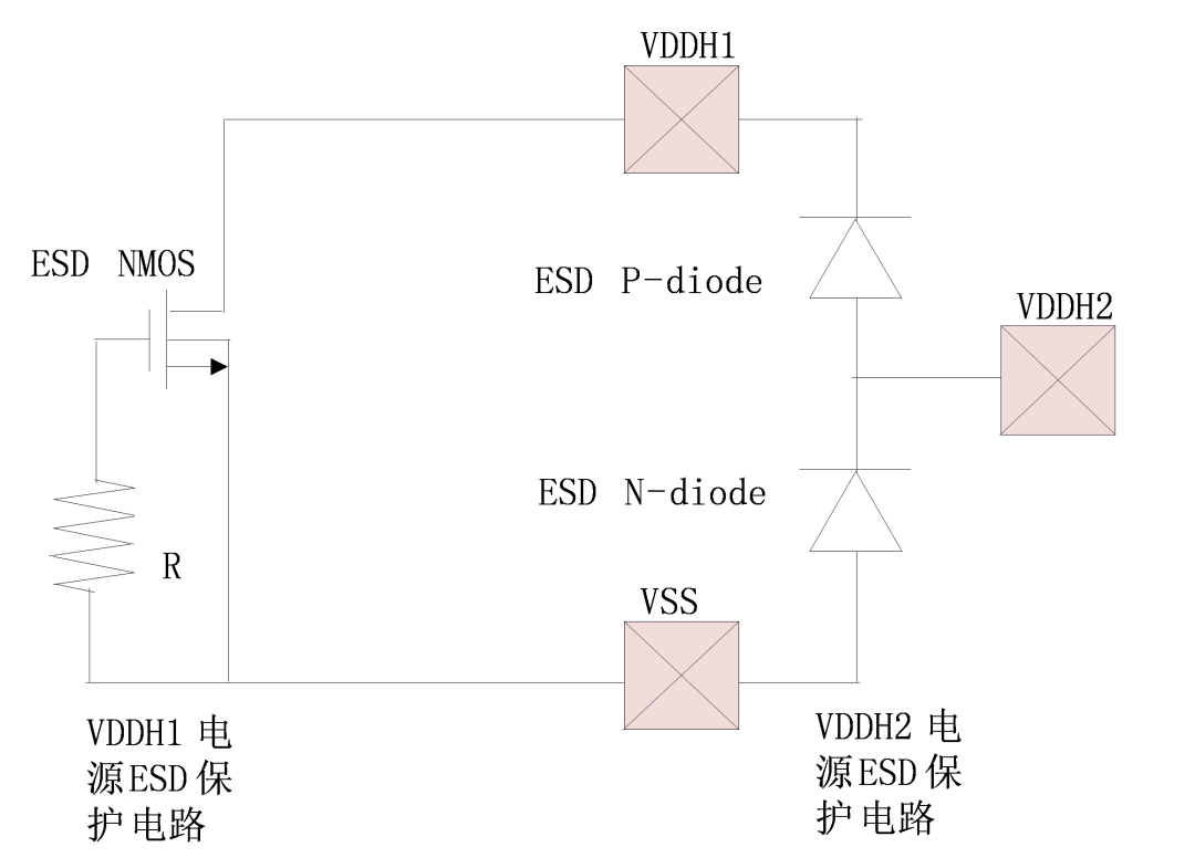 芯片非正常的上电顺序会触发正常的ESD保护电路的二级管或者是寄生的二极管,从而触发寄生NPN和寄生PNP,导致闩锁效应。图4-17所示的是电源的ESD保护电路,当VDDH2先于VDDH1上电时,VDDH2与VDDH1之间的ESD P-diode会被导通,VDDH2把空穴注入到衬底中,如果该ESD P-diode距离其它的NMOS足够近,它们形成的PNPN结构就有可能被触发。