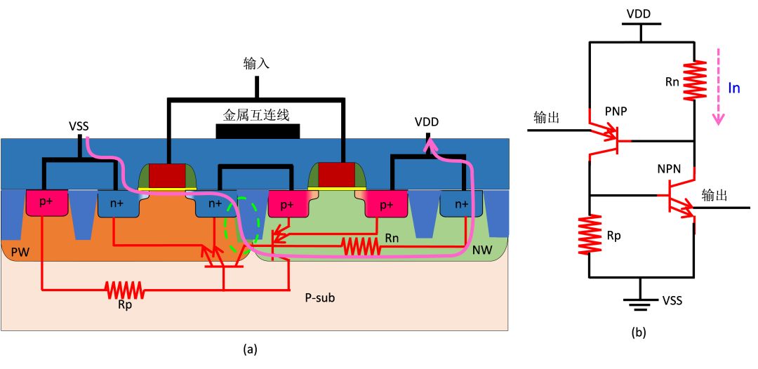 图4-5所示输入管脚是用ESD P/N-diode做ESD保护的,当输入管脚的瞬态电压突然下冲,并比连接到PW电压VSS低0.6V时,连接输出管脚的ESD N-diode导通,由ESD N-diode与NW形成的寄生NPN导通,N-diode将电子注入到PW衬底中,电子在PW衬底中是少子,依据双极型晶体管原理,这些注入的电子有一部分会与空穴复合,有一部分会扩散到PW与NW之间反偏PN结边界附近,这部分电子会被加载在PW与NW之间的强电场加速进入集电区,最后被集电区收集,也就是被NW收集,形成In电流,该电流会在NW衬底的等效电阻Rn上形成欧姆压降In*Rn,如果In*Rn>0.6V,连接输入管脚的PMOS源极p+有源区与NW之间的PN结正偏,也就是寄生PNP的发射结正偏,寄生PNP导通,此时PNP和NPN同时导通,PNPN结构形成低阻通路,并发生闩锁效应。图4-10所示的是输入管脚N-diode将电子注入到PW衬底。
