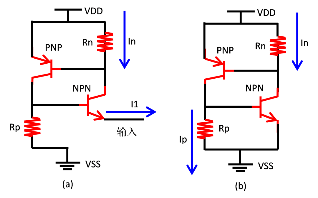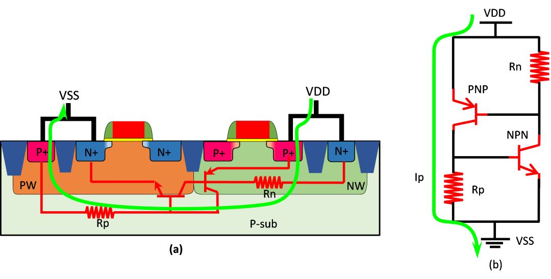 正常情况下,CMOS是通过沟道传递电流,衬底不会出现大量电流。但是各种形式的浪涌信号和ESD脉冲信号会造成衬底出现大量的空穴或者电子,它们被PW或者NW收集形成电流,并在PW或者NW的等效电阻上形成欧姆压降,使寄生NPN和PNP导通,导致闩锁效应。本质上来说,闩锁效应的问题是衬底出现大量空穴或者电子的问题。