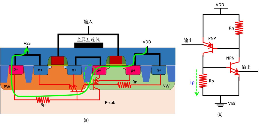 如果NW的结深很浅,P-sub衬底到NW的p+有源区距离很近,电源管脚出现瞬间浪涌信号也会使NW与P-sub之间PN结的耗尽区与NW的p+有源区穿通,从而产生的电流Ip流过PW旁路电阻Rp,并产生欧姆压降Ip*Rp,如果该反馈电压Ip*Rp>0.6V,PMOS源极p+有源区与NW之间的PN结正偏,也就是寄生PNP发射结正偏,寄生PNP导通,PMOS源极p+有源区将空穴注入到NW衬底中,空穴在NW衬底中是少子,依据双极型晶体管原理,这些注入的空穴有一部分会与电子复合,有一部分会扩散到PW与NW之间反偏PN结边界附近,这部分空穴会被加载在PW与NW之间的强电场加速进入集电区,最后被集电区收集,也就是被PW收集,形成Ip电流,该电流会在PW衬底的等效电阻Rp上形成欧姆压降Ip*Rp,如果Ip*Rp>0.6V,连接输出管脚的PMOS漏极p+有源区与NW之间的PN结正偏,也就是寄生PNP的发射结正偏,寄生PNP导通,此时PNP和NPN同时导通,PNPN结构形成低阻通路,并发生闩锁效应。图4-14所示的是输出管脚PMOS漏极p+有源区将空穴注入到NW衬底。