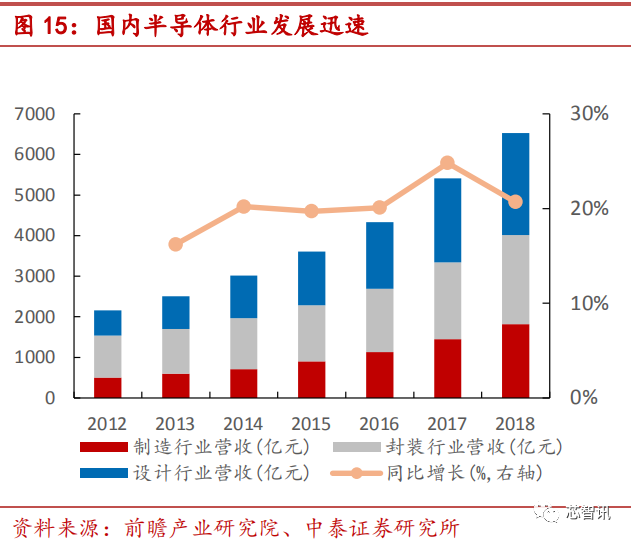 全球半导体市场规模近年来增速平稳,2012-2018 年复合增速 8.23%。其中,中国大陆集成电路销售规模从 2158 亿元迅速增长到 2018 年的 6531 亿元,复合增速为20.27%,远超全球其他地区,全球半导体产业加速向大陆转移。集成电路一般分为设计、制造和封测三个子行业,在制造和封测行业中,均需要大量的半导体新材料支持。