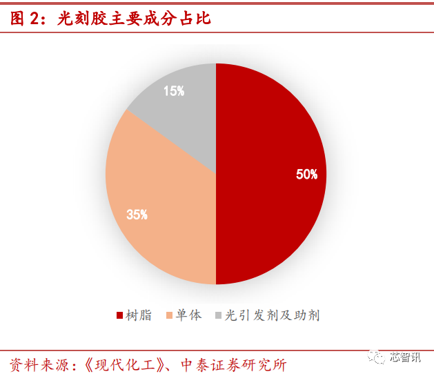 光刻胶的主要成分为树脂、单体、光引发剂及添加助剂四类。其中,树脂约占 50%,单体约占35%,光引发剂及添加助剂约占15%。