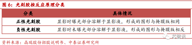 光刻胶可依据不同的产品标准进行分类。按照化学反应和显影的原理,光刻胶可分为正性光刻胶和负性光刻胶。如果显影时未曝光部分溶解于显影液,形成的图形与掩膜版相反,称为负性光刻胶;如果显影时曝光部分溶解于显影液,形成的图形与掩膜版相同,称为正性光刻胶。