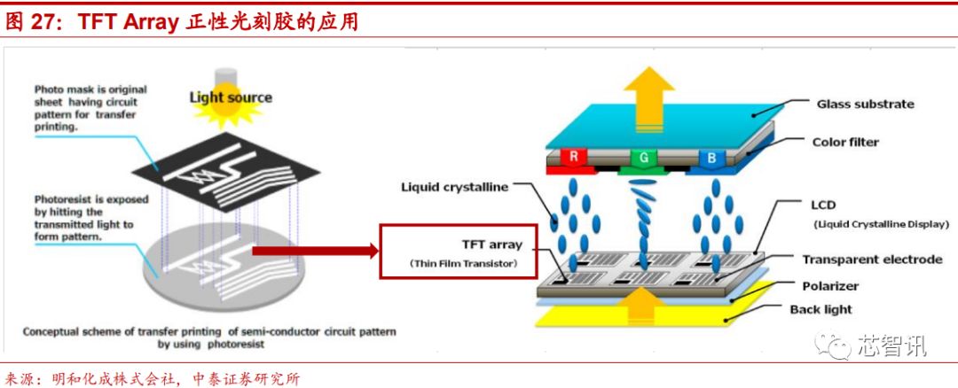 除了RGB光刻胶和黑色光刻胶之外,TFT Array 正性光刻胶也非常重要,其主要用于 TFT-LCD 制程中的 Array 段,主导 TFT 设计的图形转移,其解析度、热稳定性、剥膜性、抗蚀刻能力都优于负性光刻胶。