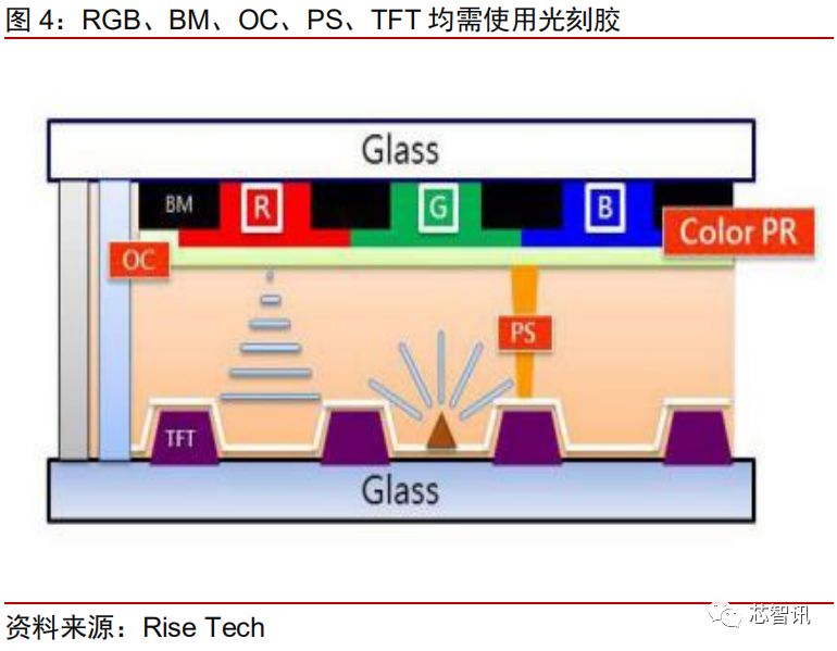 从成本方面来看,彩色滤光片占面板总成本的 14%-16%,而彩色和黑色光刻胶占彩色滤光片成本的 27%左右,其中黑色光刻胶占比 6%-8%,光刻胶质量的好坏将直接影响到滤光片的显色性能。