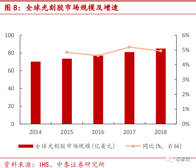 在半导体、LCD、PCB 等行业需求持续扩大的拉动下,光刻胶市场将持续扩大。2018 年全球光刻胶市场规模为 85 亿美元,2014-2018 年复合增速约 5%。据 IHS数据,未来光刻胶复合增速有望维持 5%。