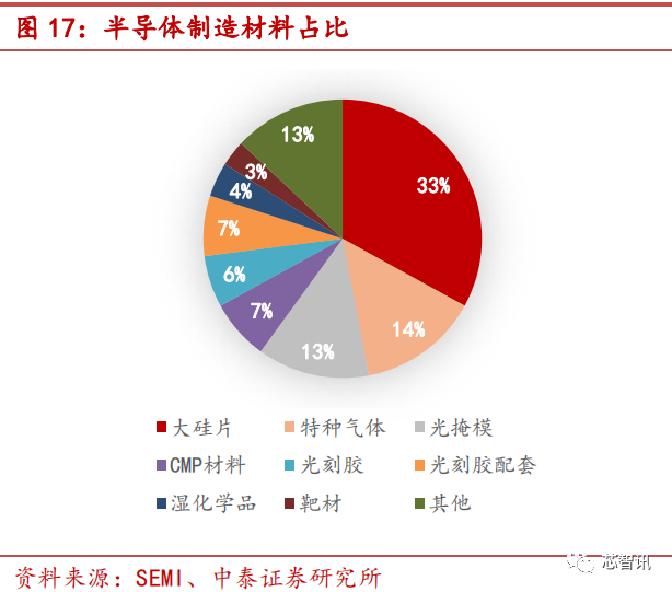 2018 年全球半导体材料市场产值为 519.4 亿美元,同比增长 10.68%。其中晶圆制造材料和封装材料分别为 322 亿美元和 197.4 亿美元,同比+15.83%和+3.30%。2018年,在市场产值为 322 亿美金的半导体制造材料中,大硅片、特种气体、光掩模、CMP材料、光刻胶、光刻胶配套、湿化学品、靶材分别占比 33%、14%、13%、7%、6%、7%、4%、3%。分地区来看,目前大陆半导体材料市场规模 83 亿美元,全球占比 16%,仅次于中国台湾和韩国,为全球第三大半导体材料区域。