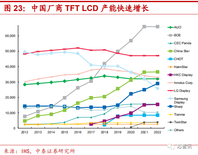全球 LCD 面板产业经历了“美国研发—日本发展—韩国超越—台湾崛起—大陆发力”的过程,美国最早研发出 LCD 技术后,80 年代后期由日本厂商将 LCD 技术产业化,全球面板产业几乎被日本企业垄断。90 年代后,韩国和中国台湾面板厂快速崛起,开始长时间主导市场,大陆面板自 2009 年开始发力,以京东方为首的大陆面板厂商产能持续翻倍增长。据 IHS 数据,2018 年大陆 LCD 产能占有率已达到 39%,预计 2023 年大陆产能将占全球总产能的 55%。