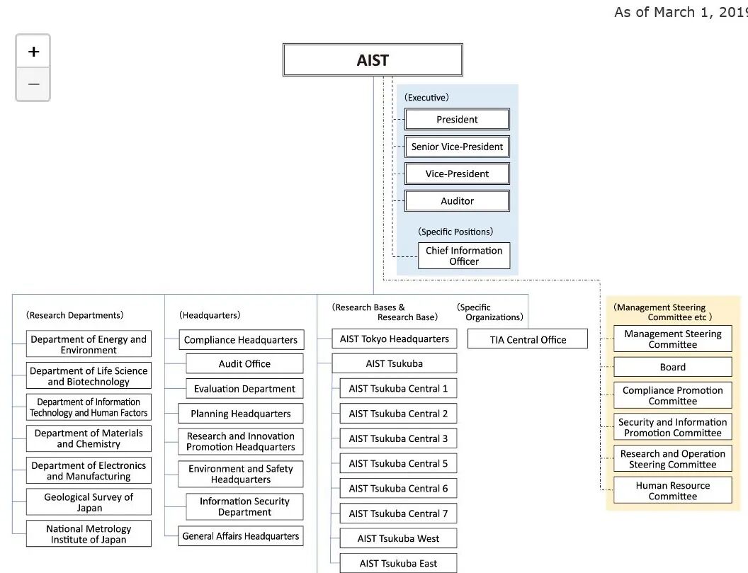AIST组织构架的最高层是理事长、监事,同时设有顾问。理事长及监事都由主管大臣任命,顾问负责参与策划研究所事务中的重要政策措施,并负责对特定事项的处理,一般是非全职人员。在理事长之下,研究组织构架包括研究管理部门、研究实施部门及研究关联部门。研究管理部门负责研究机构自身的管理与运作,包括理事长直属部门、监事直属部门及普通管理部门三类。研究关联部门是支撑研究实施的部门,包括计划部、产学官合作部、成果普及部、国际部等11个组织。