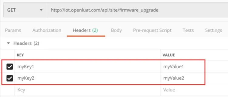 此标签页下配置的参数,直接填充到http.request接口中的head参数即可,例如下图,在Headers标签页下手动输入了两个header。