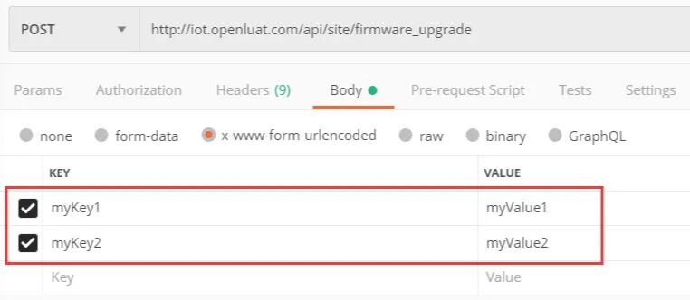 如下图所示,以x-www-form-urlencoded格式配置了2个参数。
