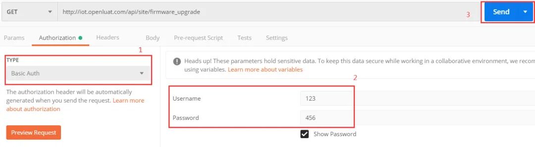 Authorization标签下选择Basic Auth认证方式,用户名配置为123,密码配置为456,然后点击Send按钮发送http请求,如下图所示: