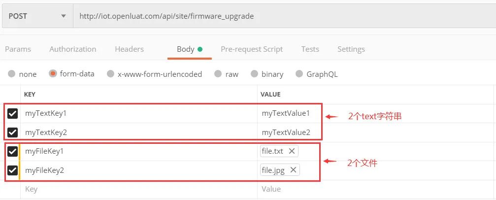 如下图所示,以form-data格式配置了4个参数,2个text字符串,2个文件。