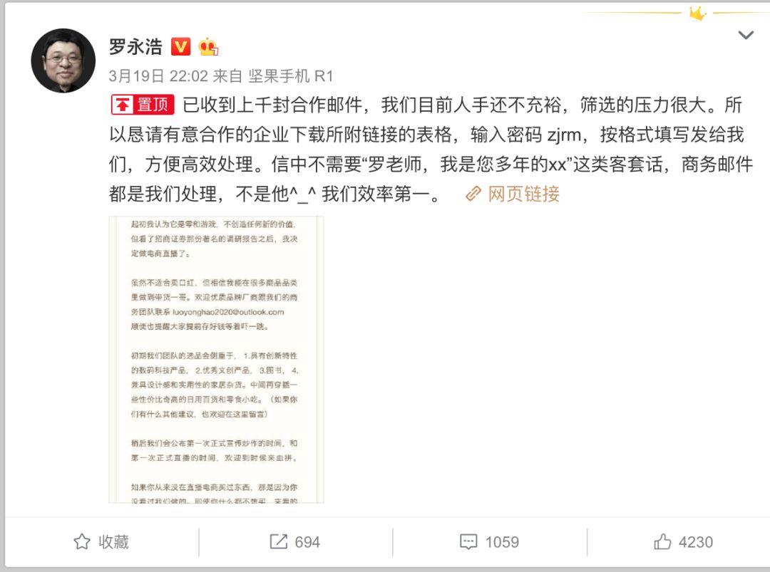 3 月 20 日消息,罗永浩发微博称今后将转型做电商直播,他在微博中透露,今后会做电商直播,但不卖口红。