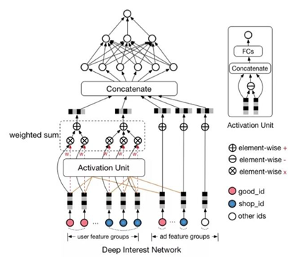 又如较新的DIN模型,引入了attention的机制,通过attention network来组合embeddings,而不是类似之前的concatenate的方式。