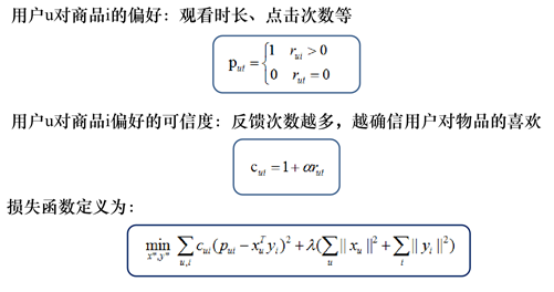 以观看时长作为用户对于商品的偏好为例,在观看时长大于某个程度作为喜好的标准,设定评分为1,否则为0。同时设置偏好的可信度作为损失函数的权重,理解为偏好越大,权重越大。则隐向量计算方法如下所示: