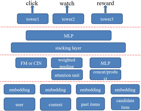 花椒直播模型的结构十分明确,原始数据包括用户特征,上下文特征,过去历史特征,当前需要预测的物品特征等。对于特征进行嵌入操作,在特征交互层可以使用上文提到的很多结构,如W&D, FM, attention。随后加入DNN结构进行特征融合,最后输出多目标预测结果。等结构如下: