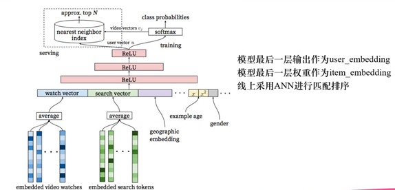 但是仅仅运用到id类特征并没有充分使用用户和物品的属性特征,因此随时技术进步,越来越多平台开始把属性特这个加入到深度学习中来提取隐向量。以下是youtube的召回模型结构: