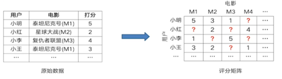 以电影推荐为例,我们知道用户对于历史观看过的电影的评分,将原始数据格式转化为评分矩阵,如下所示: