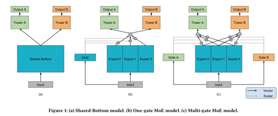 MMoE:将共享的底层表示层分为多个expert,同时设置了gate,使得不同的任务可以多样化的使用共享层。如图,a)是最原始的多任务学习模型,也就是base,b)是加入单门(one gate)的MoE layer的多任务学习模型,c)是文章提出的模型。可以看出,c)本质上是将base的shared bottom换成了MoE layer,并对每个任务都加gate