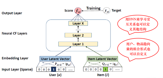 以NCF为例,通过对user_id和item_id的one-hot编码,经过嵌入形成隐向量,用DNN取代内积,输出目标预测值,通过损失函数求梯度进行反向传播训练模型。如下图所示:
