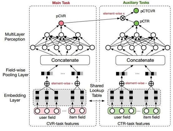 仔细观察上图,留意以下几点:1)共享Embedding CVR-task和CTR-task使用相同的特征和特征embedding,即两者从Concatenate之后才学习各自部分独享的参数;2)隐式学习pCVR 啥意思呢?这里pCVR(粉色节点)仅是网络中的一个variable,没有显示的监督信号。