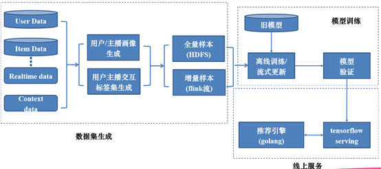模型训练和更新的逻辑如下,将模型数据整理好,全量样本存入HDFS中,以周或者天为单位进行模型更新,增量样本flink流处理,进行离线训练和更新,以满足实时性的要求。模型验证通过线下指标对模型进行监控,训练好之后采用tensorflow serving这种框架提供服务。推荐引擎使用golang来处理用户请求,以及将请求转化为特征传入tensorflow serving中。