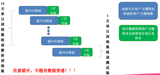 在训练数据的生成上,我们根据当天的用户与主播的交互程度形成征服样本,根据之前的历史数据组成用户画像和行为特征。在生成数据的时候,要注意不能有数据穿透,基本流程如下图所示: