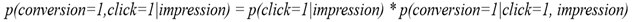 阿里的ESMM模型还考虑了点击的过程,并引入了浏览转化率(pCTCVR)的概念,即为在浏览的条件下既点击又转化的概率,即: