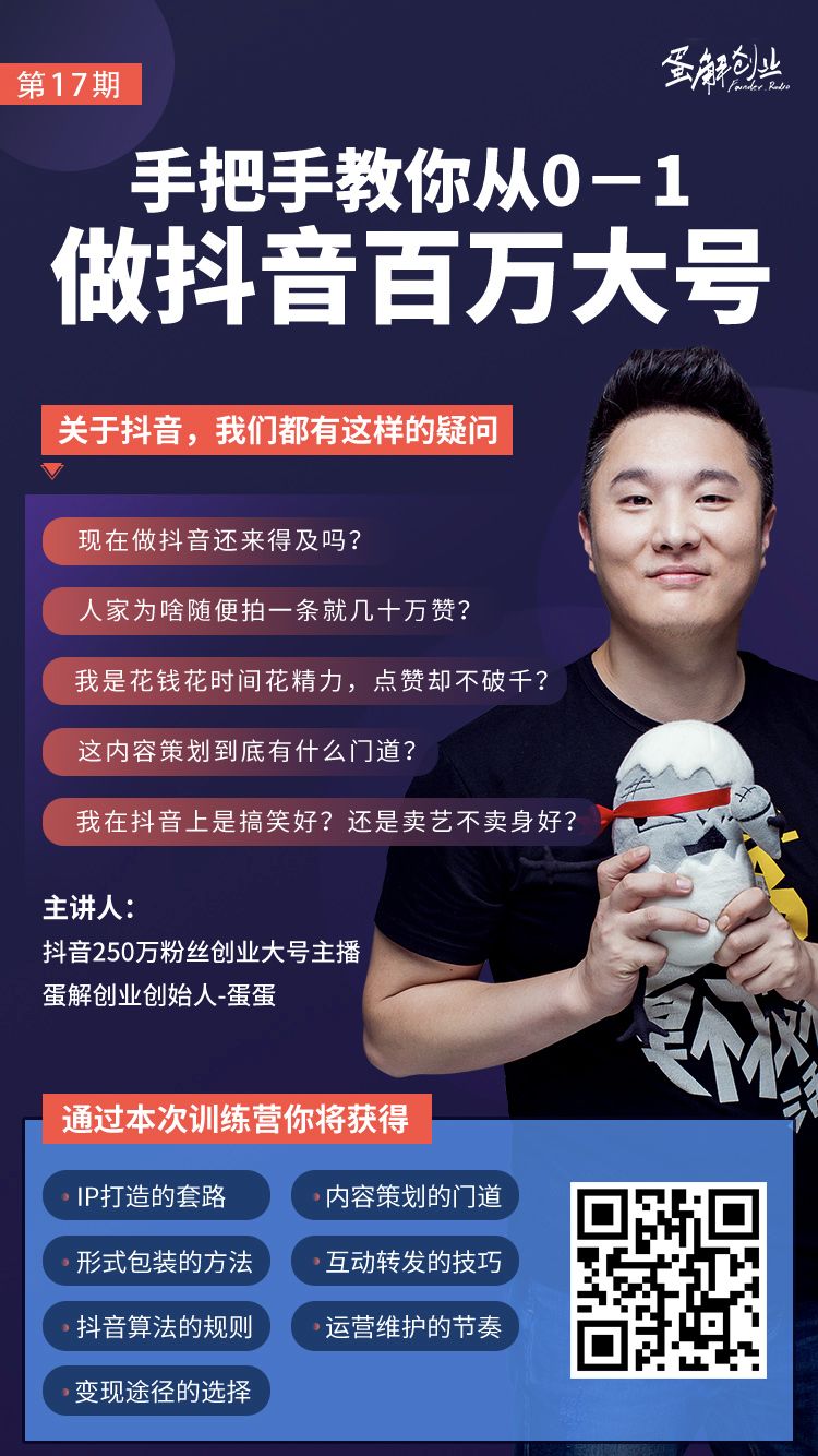 于是,在调研了近千位抖音用户的真实需求,几百个抖音大V账号的真实运营情况,找到共同的问题,并分析问题的本质,历经3个月精心打磨。从定选题,找到用户真实存在的问题,量化课件和讲授方式,蛋解把自己做抖音的经验和方法论总结成了一套真实有效可实操的小白抖音运营课程《小白创业 从0~1做抖音百万大号》。在课程的整体体验上,我们还加入了当下最有效的训练营模式:课程+社群陪伴式学习,更好的在社群中督促学员完成学习和作业,并有机会针对自己在抖音中遇到实际的问题进行互动交流。这样,既保证课程质量,又可以让每个学员通过学习打卡、笔记反馈、作业点评、互动答疑高效学习,让你听得懂、学得会、用的上。最后,我们用自己实战经验告诉所有在抖音迷茫的小伙伴:一次有目的学习,胜过一个团队花几个月盲目试错,因为错过“红利”可能就不在了~开班时间: