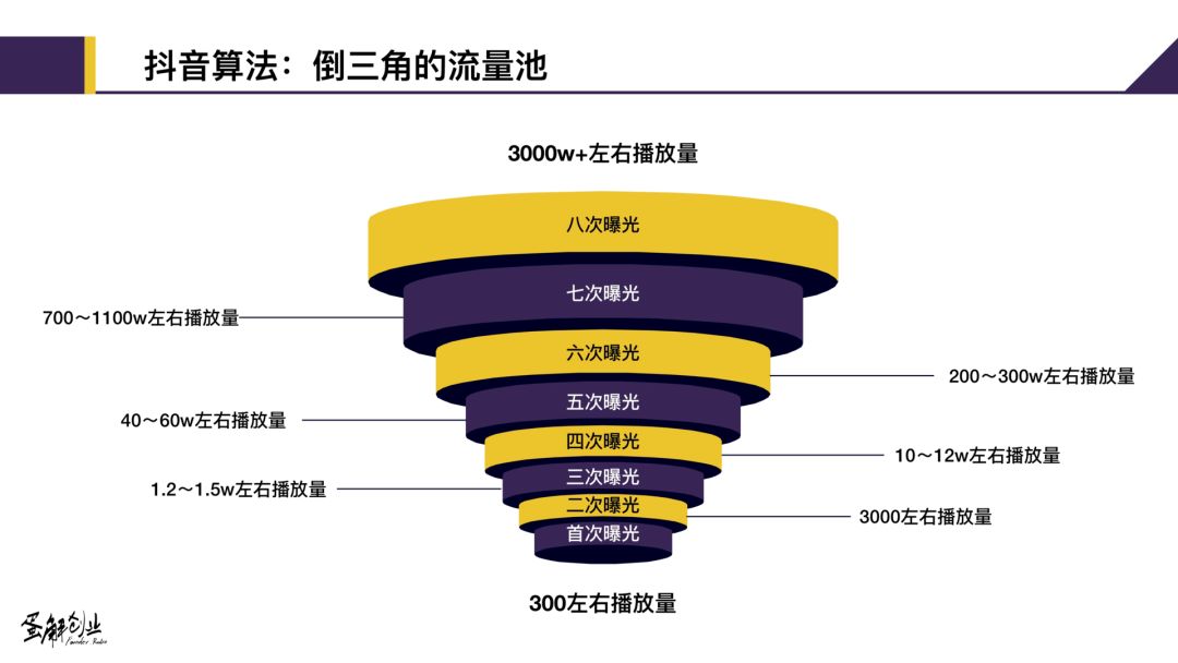 然后系统会根据数据来给视频加权计算,最核心的数据有4条:播放率、评论率、点赞率、完播率。举个简单的例子,如果你发的视频时长1分钟,有100人看了你的视频,其中只有20人看完1分钟,其他都是只看了一部分,那么完播率就是20%。当然,具体的加权算法是什么,我们就不知道了,这是抖音的核心商业机密,而且这个算法也会在实际运用中不断迭代。但我们可以知道,权重的排序大概是完播率>点赞率>评论率>转发率。道理很简单,你的视频也许开头吸引了用户,也许标题吸引了用户,也许是封面吸引了用户,但这些都不能证明你的整个视频质量高,只能证明某一部分吸引人。如果用户可以把你的视频看完,那说明你的视频真的是优质,所以把完播率的权重放在第一位也就不足为奇。比如你的账号和人民日报相比,那权重绝对不一样。人民日报权重高,初始就能获得更高的推荐量。根据今日头条的算法经验来看,如果两个账号发同样的消息(文字可以抓取内容来分析),算法会优先采信权重高的账号。但是视频应该较难遇到此情况。第二步,加权计算后,符合第二次推荐的要求,视频会被推荐到第二个流量池,3000左右。然后重复第二步的操作。统计数据,再推荐,每一次推荐都会获得更大的流量。如果某一次数据不达标,那就会暂时推荐。视频的流量也就止步了。