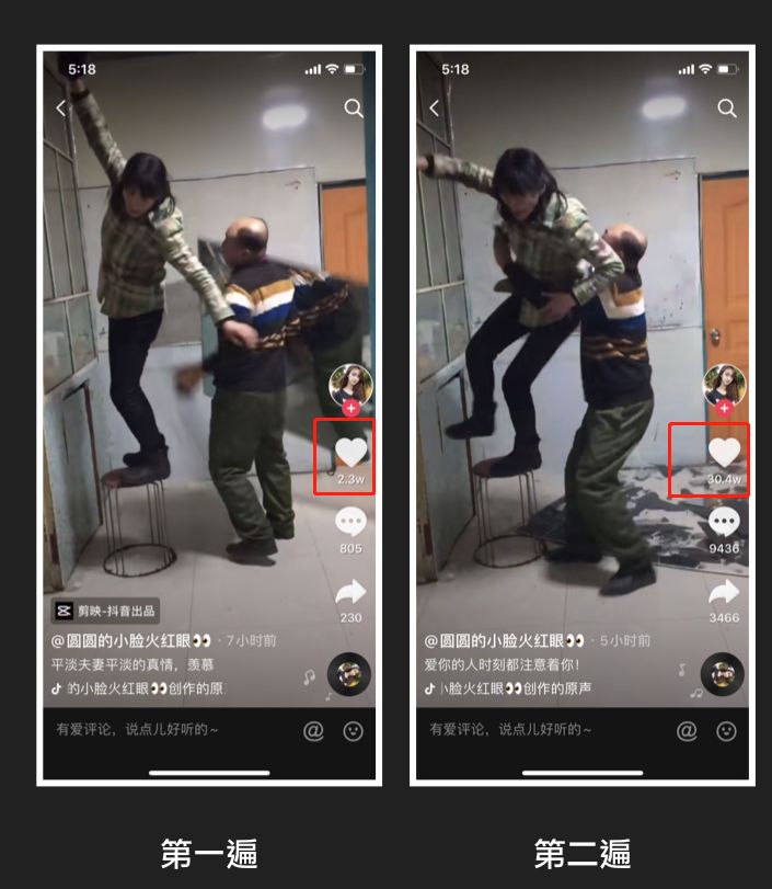 抛开内容来谈,运营要做的是To算法,而不是To用户。算法认的是4大关键数据——点赞、完播、分享、评论,运营就是针对这4条因素。比如提前想好有趣的段子,视频一发出来,就评论置换段子。有的人可能就是看到评论就愿意点赞、愿意转发,也可能回复评论。直播涨粉是一个很好的手段。每天定好主题,围绕着话题与粉丝互动,同时还可以引导关注微信小号、公众号,转化到私域流量 。直播的黄金时间是每天晚上8-10点,直播也是带货效率最高方式。当你回复评论并转发,就会出在他关注列表里。当粉丝点击后,你就能增加阅读量,顺带互动。所以评论区一定要经营好,而且不光是自己的评论区,也可以去关注别人的评论区。有时候你会发现,一条优秀的评论甚至比视频更能吸引人。在别人视频下回复评论,也能蹭别人热度,特别是一些大号,当他们对你的评论感兴趣时,或许会点进主页来看。 圆圆的小脸火红眼这个账号就是同一条视频发两遍,第一遍点赞2.3W,第二遍点赞30.4W。第一条的标题是平淡夫妻平淡的真情,羡慕。第二条是爱你的人时刻都注意着你。花钱买DOU+,可以上热门。DOU+是抖音官方的平台,最低100元就能投,投放时可以选择人群的性别、年龄、地区等。花的钱越多,效果越好。至于投入产出比如何,那就要看经验了。