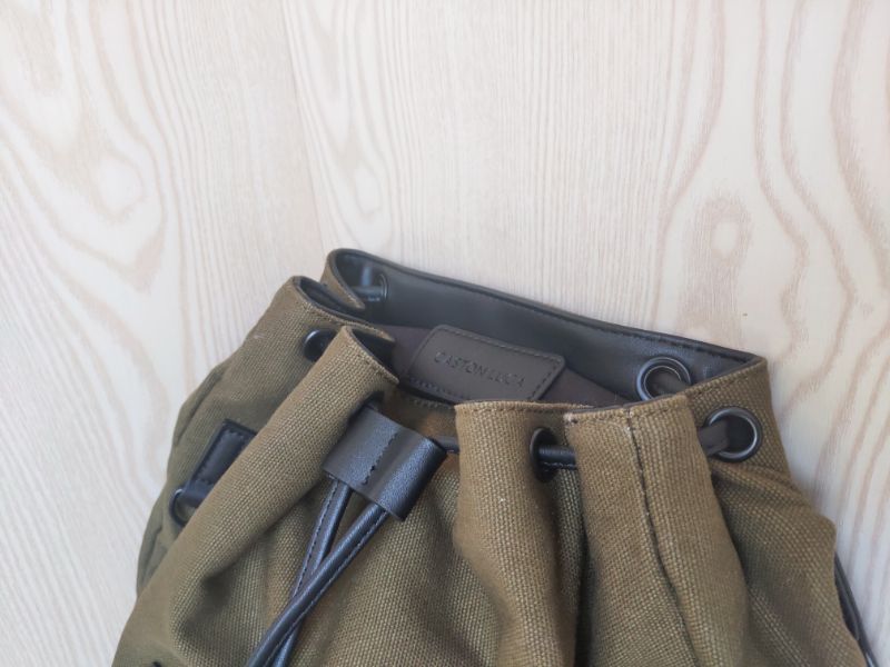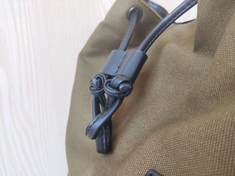 在包的束口部分也是个新颖的设计,我们可以看到它采用了大多数桶包才有的设计,采用了束口带的设计,通过抽紧皮绳来收束包口,这样的设计可能更加适合男生。