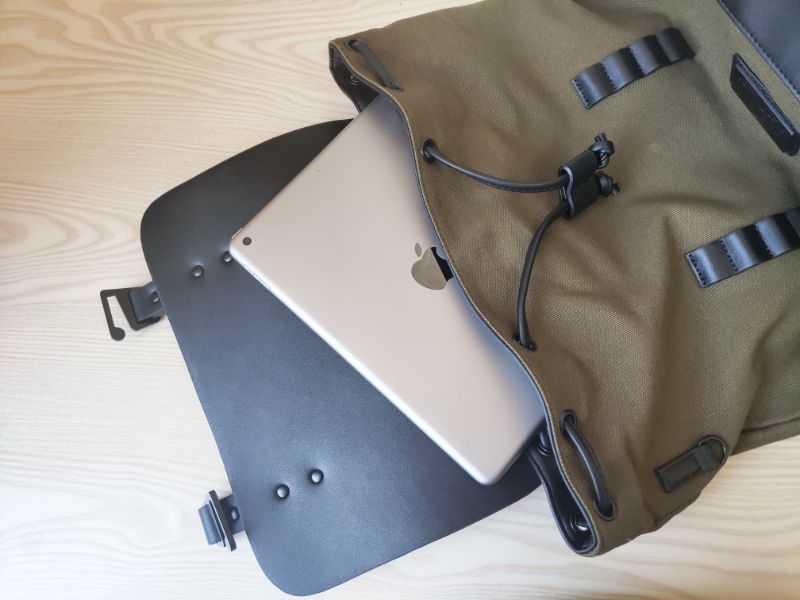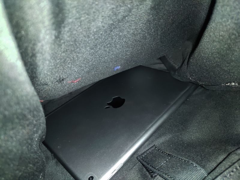 首先,我们来看看包口容纳的最大宽度,楼主将一台 iPad 2018 款斜着放入包中,可以看到不管是宽度还是高度,这个包口的容纳体积非常大,对于像楼主这样通勤使用,放把伞,放个 iPad,再放点零七零八的东西,完全没有压力。